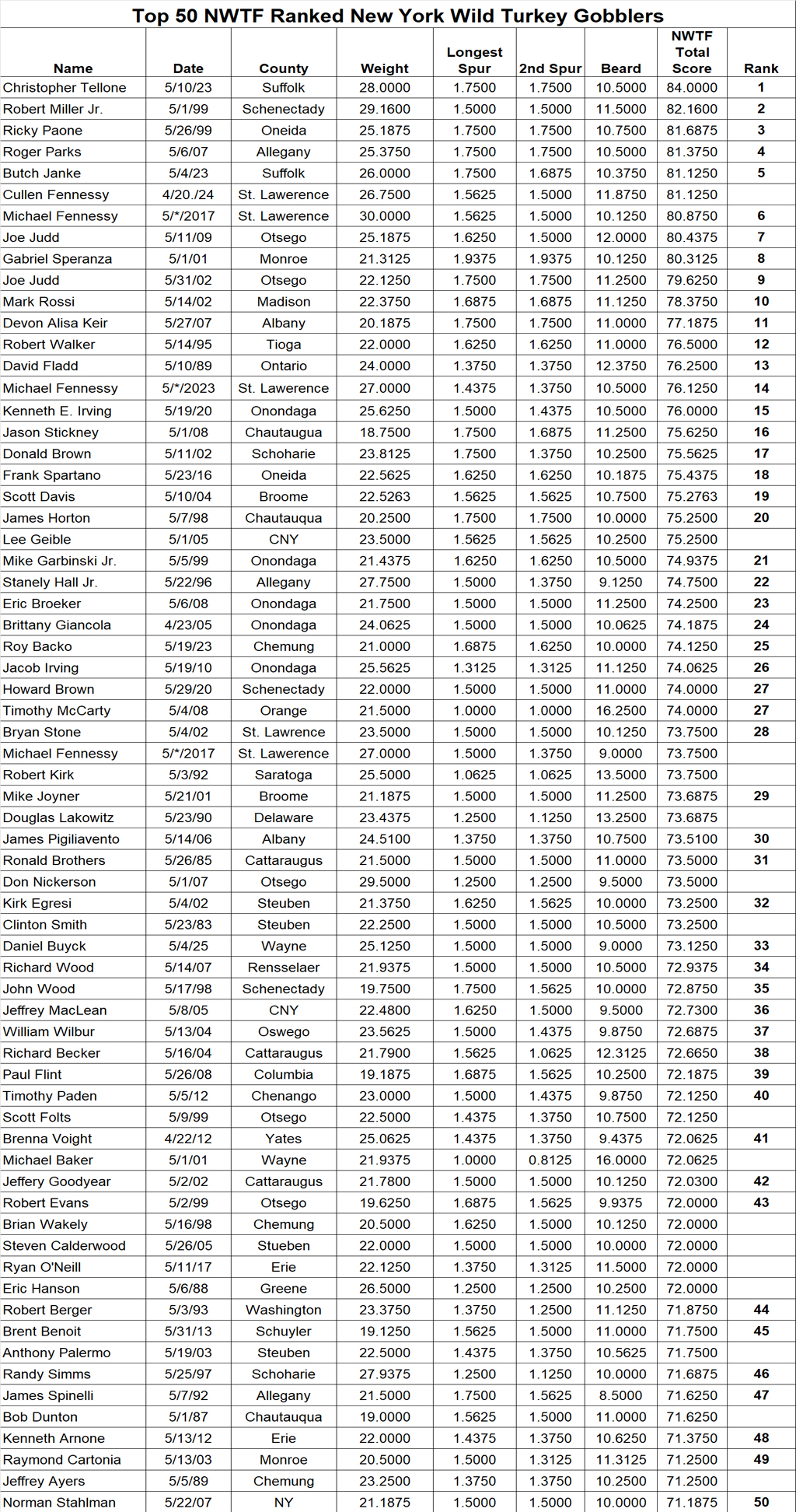 Records Data is derived by the following sources: Wild Turkey Records Database Queries 1/9/03 -7/13/23 - National Wild Turkey Federation, www.nwtf.org. Spinning Wheel Spring/Fall Contests 1996-2005. Independant, vetted Record submissions to Joyner Outdoor Media