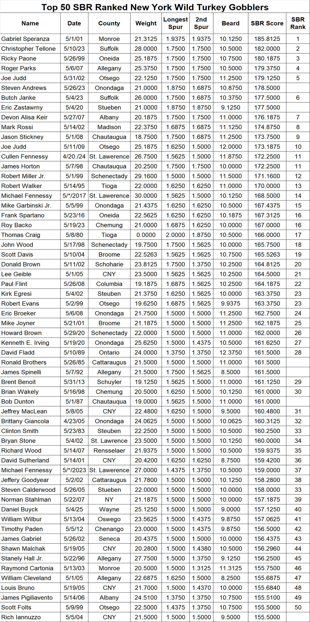 Records Data is derived by the following sources: Wild Turkey Records Database Queries 1/9/03 -7/13/23 - National Wild Turkey Federation, www.nwtf.org. Spinning Wheel Spring/Fall Contests 1996-2005. Independant, vetted Record submissions to Joyner Outdoor Media